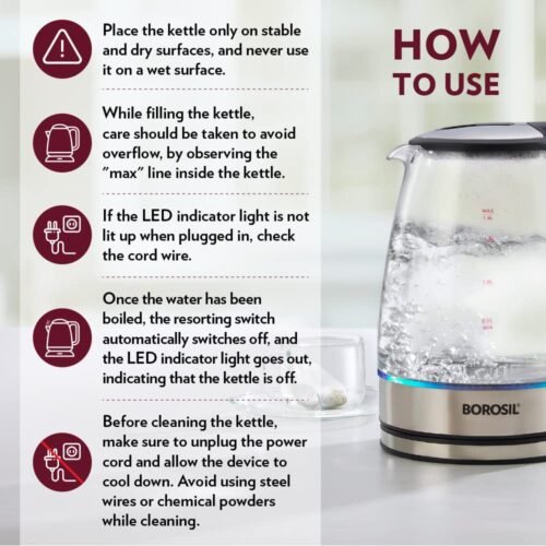 - Warranty : This glass kettle comes with a 1-year warranty by Borosil against any manufacturing defects.
