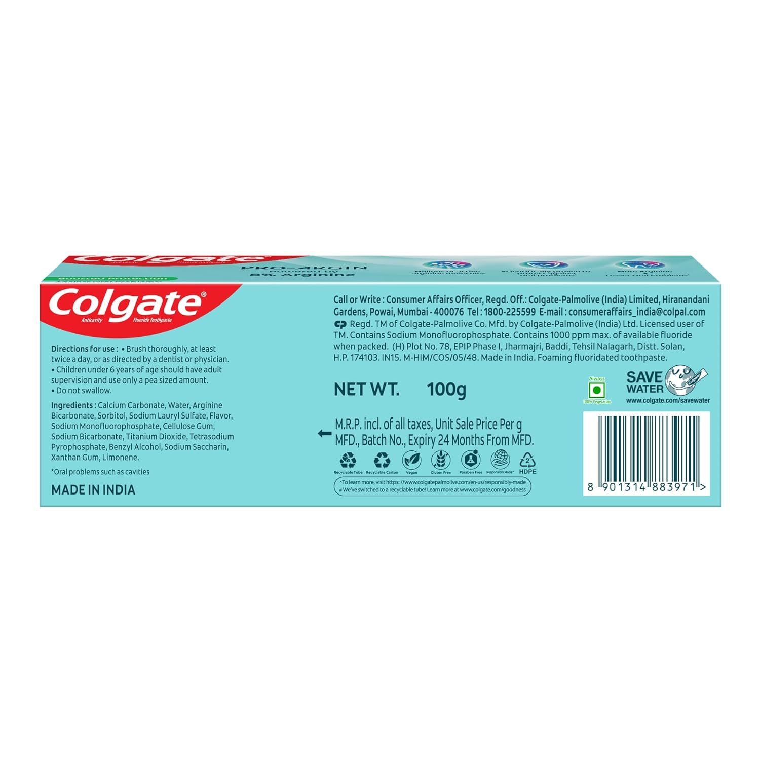| Manufacturer | Colgate-Palmolive (India) Ltd., Colgate-Palmolive (India) Ltd. (H) Plot No. 78, EPIP Phase I, Jharmajri, Baddi, Tehsil Nalagarh, Distt. Solan, H.P. 174103. IN15. M-HIM/CO5/05/48. For product related feedback please reach out to Colgate Consumer Affairs on consumeraffairs_india@colpal.com OR Call on -1800-225599. |