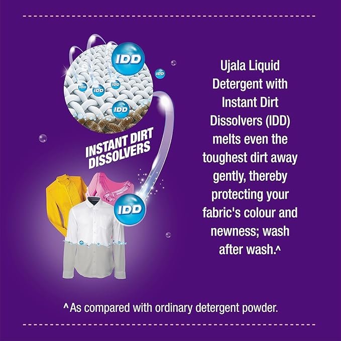 Presenting UJALA FRONT LOAD LIQUID DETERGENT – a revolutionary liquid detergent for bucket and front load washing machines. Specially made to give your clothes the best cleaning experience by removing tough dirt, effortlessly. It is powered with Instant Dirt Dissolvers that melts even the toughest dirt gently protecting fabric colors and retains newness, wash after wash. Ujala front Load Liquid Detergent dissolves completely ensuring it leaves no residue on your clothes. Ujala front load liquid detergent also has a refreshing fragrance that gives your clothes a long-lasting freshness. It has unique cap ensures 0 percent spillage and easy dosing, providing you a non-messy and delightful washing experience. What’s more, it also has 99.9% Germ Kill Protection formula that keeps the clothes germ-free. Machine or Bucket wash, it works well with either. Looking for an effortless washing experience? Don’t expect anything less from Ujala front Load Liquid Detergent.